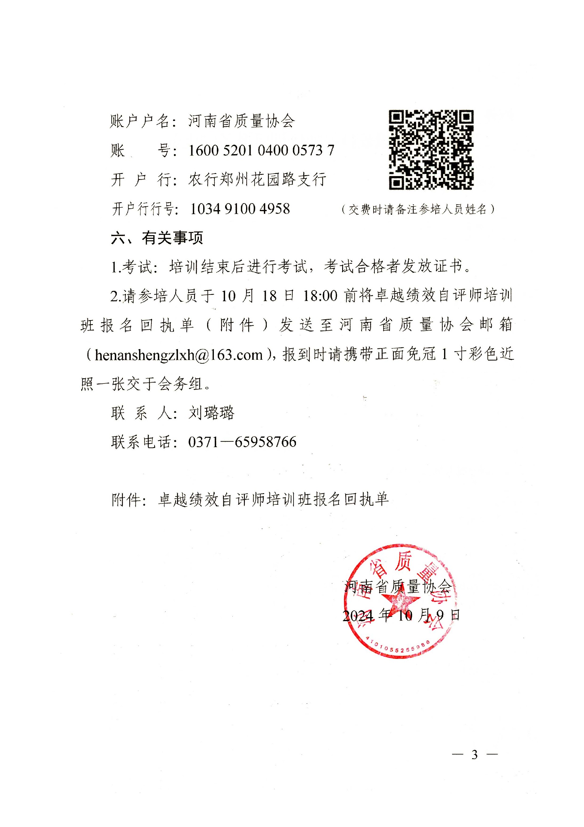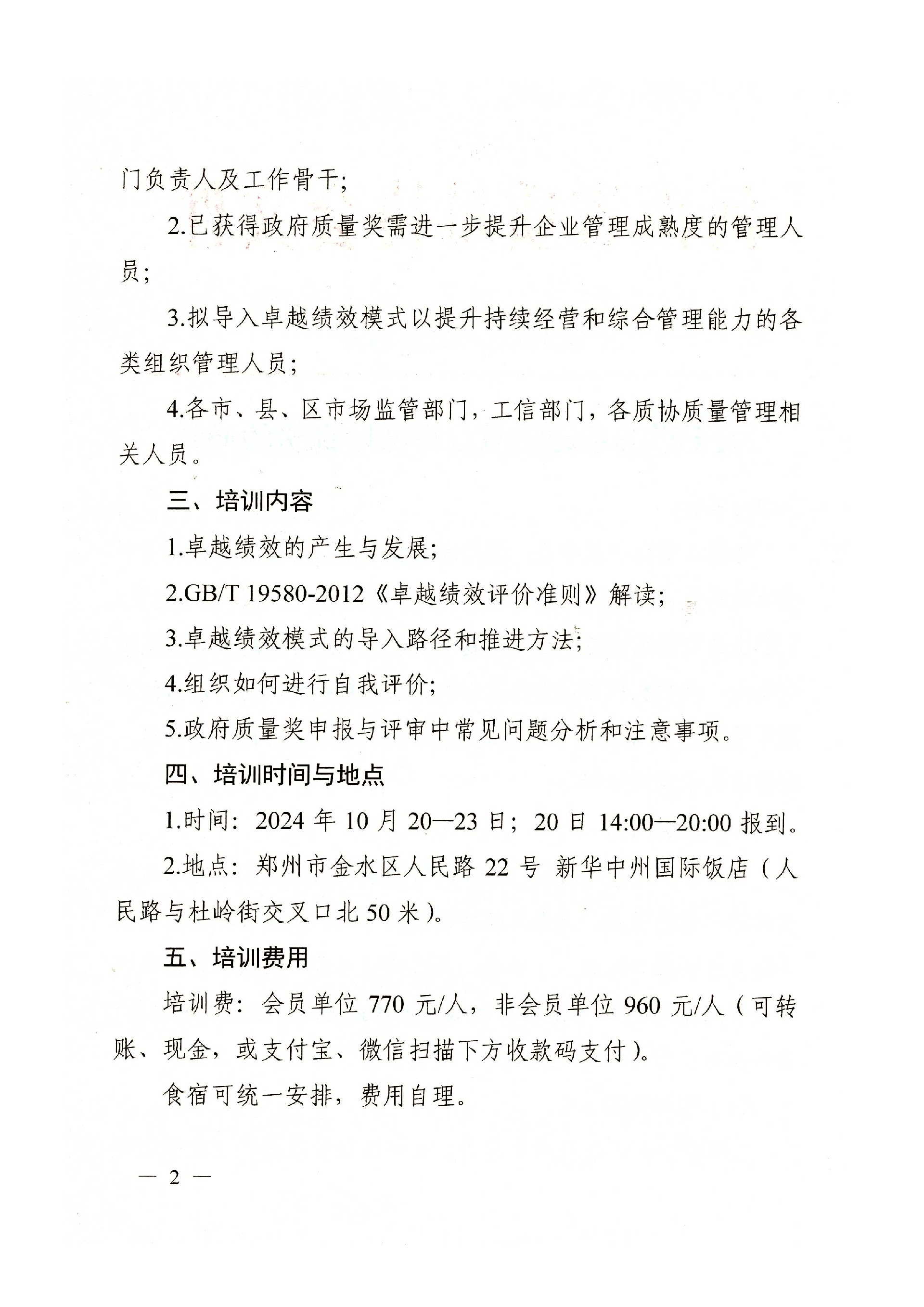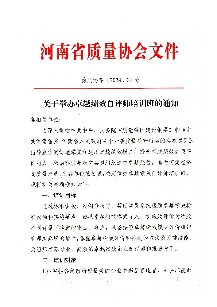 转发河南质量协会关于举办卓越绩效自评师培训班的通···